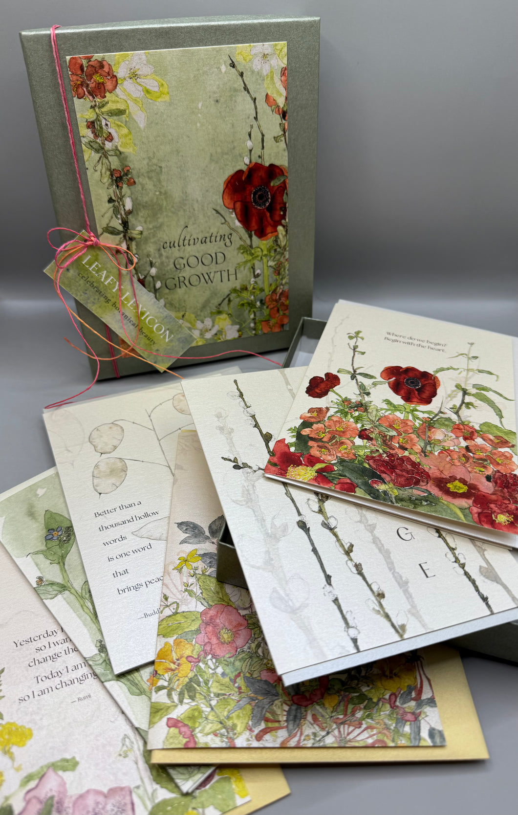 A luscious boxed set—all printed on pearlescent paper with original watercolor botanicals and excellent quotes for cultivating positive growth in our inner and outer environments.